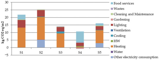 Climatic conditions are also a relevant parameter which determine the use and characteristics of buildings and demands [53]. The lowest CC associated with heating was found in the school S4 (Portugal), in which individual electric heaters are only occasionally used in cold days. Therefore, the low CC associated with S4 building is likely attributable to the climatic conditions. In spite of similar latitude, climatic condition makes great difference. According to Gervasio et al. [28], the values for the operational carbon have a much higher variation within each climatic area, and it is higher in the Northern Europe than in the South. Furthermore, it is found that the green spaces play a role, with a contribution of gardening (negative CC because the sequestration of CO2 by trees). Other building features that could affect the building’s energy consumption, such as the windows frame, building insulation, or exposition, were not characterized, which is a limitation of this study.