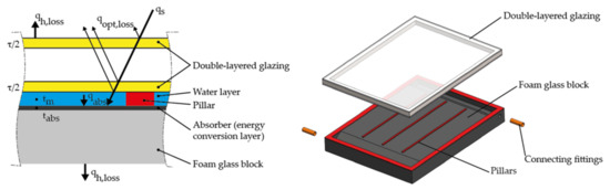 The basic philosophy of the proposed design is based on the change in the material and construction layout of the proposed solar collector. The presented concept consists of four main construction parts—foam glass insulating block with a top surface coating, transparent glazing, pillars, and connecting fittings. In the presented concept, the black non-selective surface coating of the foam glass insulating block acts as an absorber and, therefore, creates a photothermal converter. On this surface, shortwave solar radiation is converted into heat, which is directly transferred to the heat transfer medium. Figure 1 (left) shows, in a partial cross-section view, the basic arrangement of parts and the energy balance of the solar collector. The figure depicts heat fluxes representing heat gains and losses, where qs is solar radiation, qh,loss is the heat loss from the transparent cover and the back of the collector, qopt,loss are optical losses caused by reflection and absorption of radiation through the transparent cover, qabs is the heat flux dissipated by the absorber (i.e., useful heat), tm is the temperature of the heat transfer medium, tabs is the temperature of the absorber, τ is the transmittance of the solar collector glazing.