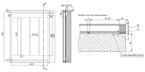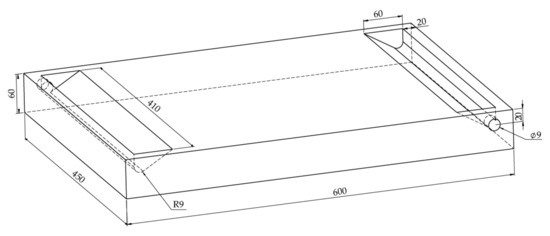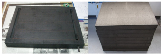 Due to the limited offer of foam glass, the prototype has dimensions of 600 × 450 mm, but the concept can be used analogously in the construction of a collector of classic dimensions (i.e., 2000 × 1000 mm). In the proposed concept of the solar collector, we considered the use of a block construction of the solar collector body, which integrates the thermal insulation and the back enclosure frame, respectively, into one block. This block is also part of the heat transfer fluid distribution system, which functions as an absorber and, respectively, a photothermal converter. The key part of the proposed collector, the conversion-insulating block, is made of foam glass. This material has good thermal insulation properties and, in comparison with other insulating materials, has the advantage of higher compressive strength, chemical inertness, and water resistance at low weight (ρ = 120 to 165 kg.m−3) [40]. Foam glass is produced by foaming glass crumbs together with pulverized coal. Since this insulating material has closed pores, it is completely watertight in its entire volume and, at the same time, non-absorbent for all liquids. For this reason, neither its thermal resistance nor its volume changes over time. Foam glass has the highest compressive strength among thermal insulation materials (compressive strength 0.7 to 1.2 MPa depending on the type). At the same time, it has high rigidity, is practically incompressible, and is resistant to extreme temperatures. In the case of the proposed collector, the block has a plate shape, and its thickness is determined by ensuring sufficient thermal resistance of the block and sufficient rigidity of the structure (frame function). Due to the value of the coefficient of thermal conductivity λ, which in the case of foam glass is 0.038 to 0.048 W.m−1.K−1 [41], it was possible to consider the total thickness of the insulating part of the block of 60 mm. The foam glass block also contains openings for connection fittings and tear-shaped recesses serving as a distribution or the collecting section of the flow channels as seen in Figure 2. Foam glass properties are summarized in Table 1.