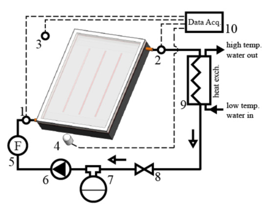 The schematic diagram of the hydraulic circuit and measuring apparatus with depicted positions of measuring devices (1, 2—inlet and outlet thermocouples, 3—ambient air thermocouple, 4—solarimeter, 5—flowmeter, 6—circulation pump, 7—expansion vessel, 8—flow control valve, 9—heat exchanger, 10—data acquisition system).
