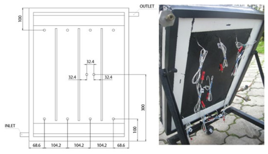In the tests process, water was used as the heat transfer medium. The measuring apparatus consisted of a series of KIMO TTKE-363 thermocouples (type K, range −40 °C to +400 °C) placed according to Figure 5 in the hydraulic circuit, which recorded the temperature of the heat transfer medium at the inlet and outlet of the collector and the ambient temperature, and in the body of the proposed solar collector according to Figure 6, which records the temperature of the heat transfer medium in the various locations in the proposed solar collector.