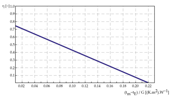 Based on these data, it is possible to compile a theoretical linear curve of the thermal efficiency of the presented solar collector, which is shown in Figure 7. A tabular representation of the thermal efficiency calculated with the use of the energy balance equation and input data according to [48] is given in Table 2.