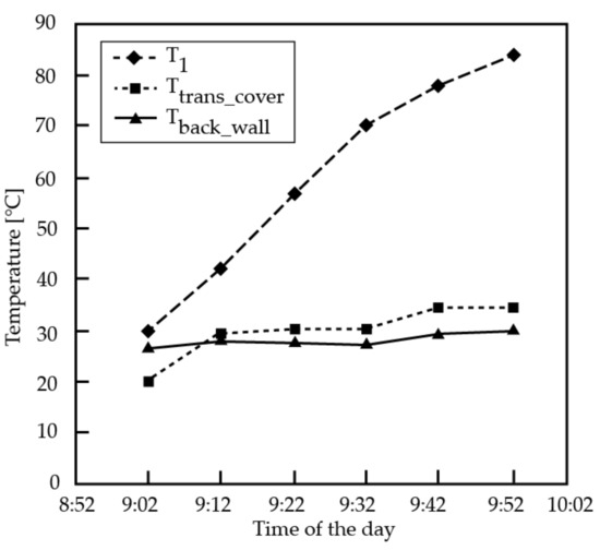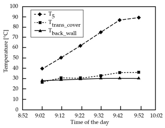 The purpose of this measurement was to obtain outputs whose values describe the relationship between the temperature development of the transparent cover and the rear insulating part of the collector, in connection to increasing the temperature of the working substance, in a certain time interval, under specific ambient conditions. The input parameters of the test were again characterized by a clear to semi-clear sky with low clouds and an ambient temperature of 21.0 °C, the initial temperature of the working substance was 21.3 °C, and a quasi-stagnant flow state (0.001389 L.s−1) was also considered again. The test was performed from 9:02 to 9:52 and the data were evaluated in ten-minute intervals. During the test, the value of solar radiation reached 500 W.m−2 (±5 W.m−2 fluctuations). The evaluated prototype was equipped with thermocouple probes at the middle of the transparent cover area and, secondly, in the middle of the back wall of the solar collector area. The values of the measured temperatures are summarized in Table 4.