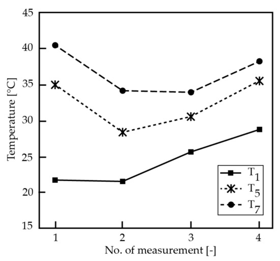 The measurement was performed to characterize the temperature increase in individual levels of the collector field, due to the change in the amount of accumulated energy, due to the predominance of the diffuse component of solar radiation. In this test, semi-cloudy weather with more pronounced diffusion radiation prevailed; the ambient temperature was 23 °C and the initial temperature of the working substance was 16.4 °C. Again, the solar collector was tested under a quasi-stagnation state, with a minimum flow rate of 0.001389 L.s−1. The measurement results summarized in Table 5 show that the individual layers of the collector array are also affected by the change in the intensity of solar radiation. For evaluation, we chose individual thermocouples from each level (T1, T5, T7), which in the monitored interval reached the temperatures listed in the table of values.