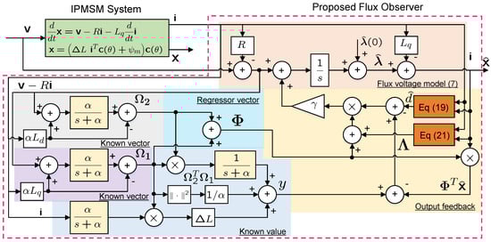 The saliency of IPMSM dynamics is dealt with elaborately by the active flux, and a vector, . A linear regression form is derived from the square of the active flux, . The high pass filter acts a role of suppressing a constant rotor flux term, . The term with rotor saliency, is carefully treated in the process of applying the gradient rule. The perturbation term, which is caused by the derivative of the d-axis current, is also taken into account when constructing an observer.