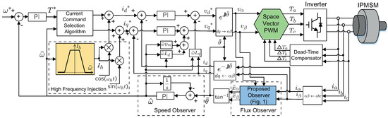Sensorless control block diagram for IPMSM that employs signal injection only in the low speed region.