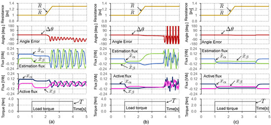Simulations were performed using MATLAB Simulink. In Figure 4, zero speed control performances are compared with the Gopinath model flux observer [8], the previous observer based on regression model [29], and the proposed observer. In all cases, the high frequency signal was injected with the speed control mode, while 0.5 pu load torque was applied from 1 s to 4 s. To see the robustness, a 30% overly estimated resistor value was used in the observer after 2 s. As soon as the resistor value is not matched, unstable oscillations are observed with Gopinath model-based flux observer in Figure 4a. In the case of the previous regression-based observer, the estimated flux error gradually increases, due to the resistor value mismatch, and the observer becomes unstable after 2 s as shown in Figure 4b. On the other hand, stable results are obtained with the proposed scheme under all situations in Figure 4c. The resistance error causes 4 angle error.