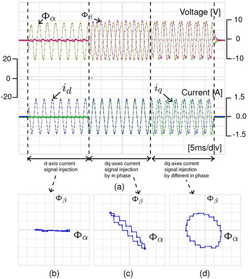 To investigate the behavior of and , three different sets of current references were injected when the motor was at standstill under no load condition: , , and . Figure 6a shows the current plots versus time, while (b), (c) and (d) show Lissajous plots of and . In the first case, only the d-axis current was utilized. In the second case, both d and q axis currents were utilized. However, they were in the same phase. The last one is a case when the d and q axis currents reference differ in phase by 90, (31)–(33). In the last case, a trajectory of and was drawn, similar to a circle. It can be represented by (33). The regressor vector satisfied the PE condition [26], It yielded a most suitable contour for the PE condition.