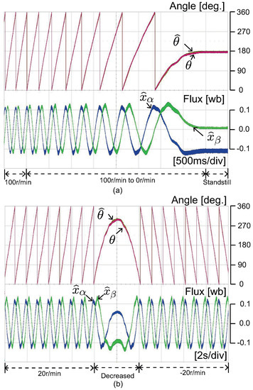 Figure 8a shows a zero speed control performance from 20 r/min to standstill. Figure 8b shows a speed control performance from 20 r/min to −20 r/min without a load. The angle was estimated correctly, even at zero speed.
