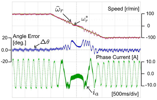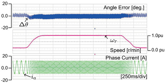 Figure 7 shows a case of starting in the speed control mode under no load condition. Initially, the angle estimation error was 90. A starting algorithm was executed during the first 500 ms. In that period, no control action was taken, but the angle was estimated with high frequency current injection. The plot shows us that the angle error converged at the zero speed state. Then, the speed was increased to 100 r/min. It should be noted that the convergence is guaranteed only when the angle error is less than at standstill. When the angle error is larger than at standstill, another polarity checking algorithm is required [35].