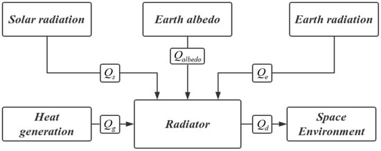 While in orbit, the thermal environment [26,27] for space radiators is complicated, e.g., inner heat generation by CCD components, heat exchange with the space environment. In the mean time, the radiator may also absorb heat from possible external heat flow, e.g., solar radiation, earth radiation, and earth albedo, as shown in Figure 1.