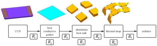 The radiator is designed for focal plane assemblies of a space camera. In Figure 4, the main components of the heat dissipation system of CCD assemblies are revealed. Along the heat transferring path, total thermal resistance consists of the following parts: , , and , each represents the contact thermal resistance between every two adjacent components. refers to equivalent thermal resistance of the gasket, represents the resistance of the aluminum sink, and represents the thermal resistance of the thermal strap.