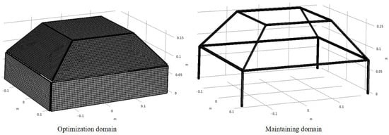 Sharp corners of the cover could result in overdense meshes. Furthermore, compared to the remaining parts of the cover, these corners are of much smaller volume and superficial area, which means corners contribute much less to the whole heat transfer process than the rest of the parts. In this case, to avoid complicated calculation on these dense meshes in topology optimization, a particular mesh procedure is done. The cover is divided into two parts, one part as the optimization domain, and the other is the maintenance domain, only involved in turning heat flow. The mesh for the two respective domains is shown in Figure 7.