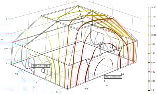 Material distribution of the radiator after topology optimization is shown in Figure 9, the color stripe represents the temperature for each isothermal surface.