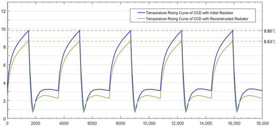 As shown in Table 5, the average maximal temperature on CCD with the reconstructed radiator is 8.626 °C, while the temperature is 9.793 °C with the initial design. An average decrease of 1.167 °C on CCD is achieved with the reconstructed radiator.