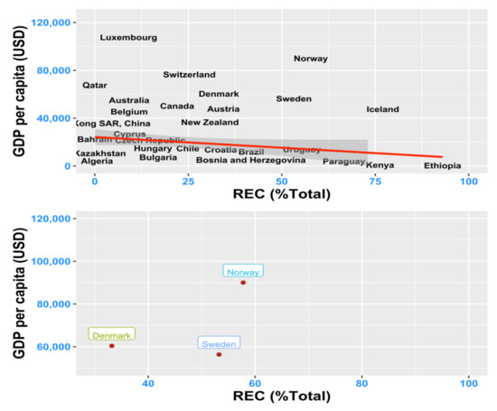Forth, as already acknowledged, there is a differential impact of some REC driving factors for different income-groups of countries. Only the CO2 intensity and total energy utilization have an overall effect on REC that remains consistent, although its intensity varies, across the sub-panels. As such, other results indicate significant different levels of the negative impact of total energy utilization on REC, the negative relationship being the strongest for middle–low income countries, and the weakest for the very high-income countries, further suggesting that, as economies grow, they increasingly direct their attention towards sustainable energy sources and carbon neutrality, although a complete decoupling between energy utilization and reliance on fossil fuel has not been consistently achieved, except for some individual “success stories” such as Iceland, Norway or Sweden.