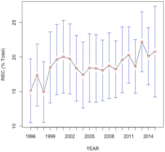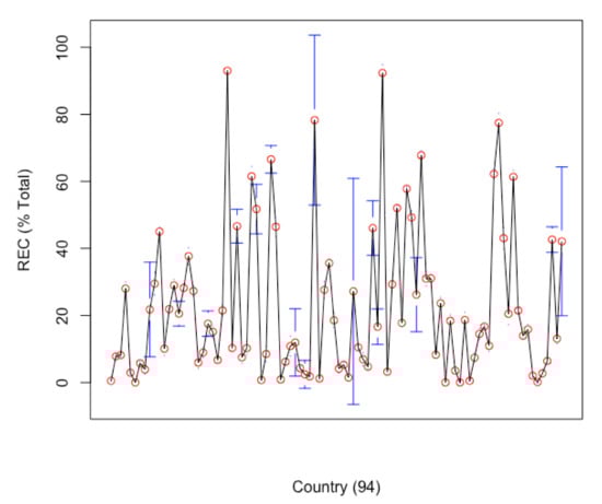 In this investigation, we have a panel regression model with fixed effects estimator for 94 countries i = 1, …, 28, observed at several time periods t = 1, …, 25, where is REC in country i and year t, while the four independent variables employed in the equation will be the income per capita (GDP per capita), R&D expenditure, CO2 intensity and total energy utilization (energy use) in country i and year t, and λi is the country specific effect. The is the error term that captures the variation in REC that is not explained by the four independent variables to , and i is 1,2,3…,n (n = 94) countries, while t is 1,2,3…,t (t = 25) years.