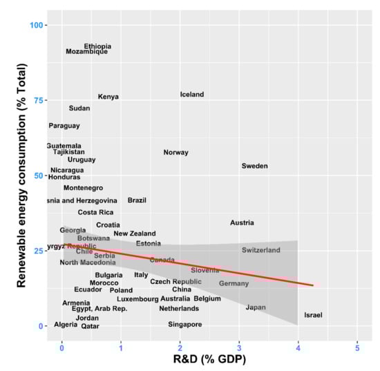 33], which conclude that research and development is the leading driving factor for renewable energy consumption in middle-income countries from G20. The additional number of countries included in our study could explain this divergence. As such, our findings suggest that public spending on R&D does not yield an automatic return in terms of increasing renewable energy consumption and allowing a country to achieve carbon neutrality. The relationship seems to be not only group-specific, but also country-specific, and as such depend on both income and the national context: while very high-income countries uniformly benefit from their R&D efforts, only some high-income countries that prioritize innovation as reflected in public R&D investments extract benefits in term of increasing dependence on sustainable sources (i.e., Iceland), whereas others do not accomplish this goal in spite of their innovative efforts (i.e., Singapore, Korea Republic, or Israel), which could be explained either by ineffective R&D sectors, ineffective energy policies or by directing their R&D efforts towards other priority areas.