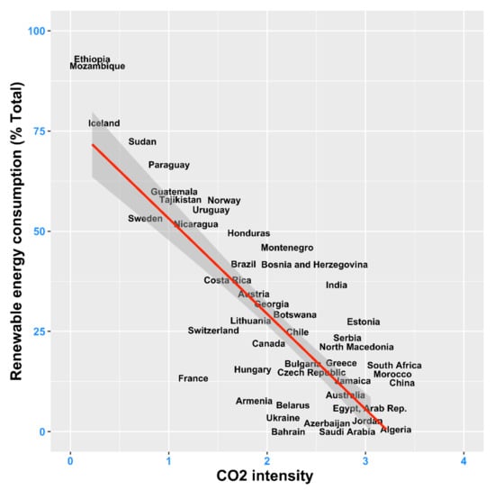 2 intensity and renewable energy consumption (slope of −17.7137) for low-income countries is explained by the fact that they generally rely heavily on biomass as a fuel source, (i.e., Ethiopia, the highest placed country in the renewable energy consumption classification in