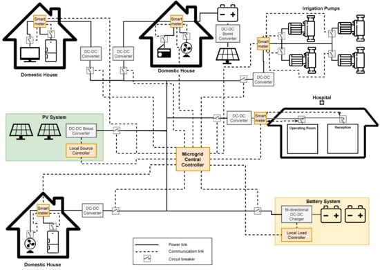 Figure 1 shows the structure of the community DC microgrid considered in this study. The microgrid follows a radial topology with households generally located within 1 km of the centralised generation system. It consists of two main subsystems: power and communication. The power subsystem consists of a network of power devices connected by electrical cables to distribute power from the source to all loads in the system. The communication subsystem consists of a network of smart devices/controllers wirelessly linked and exchange messages to control and monitor microgrid operations.