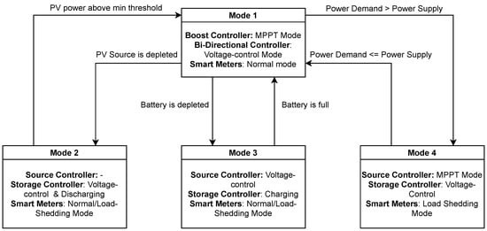 The scheme operates in four different modes depending on the status of resources in the microgrid. Transitions from one mode to another occur through communication signals exchanged between controllers. Under normal conditions, the microgrid operates in Mode 1. In this mode, the bidirectional storage controller functions in a voltage-control mode where it regulates the microgrid’s DC bus voltage. The boost source controller operates in MPPT mode, where it extracts maximum power from the PV panels. All smart meters also function in normal mode, where all appliances get power. The MGCC monitors power parameters and the system’s operational status by collecting data from the local controllers and smart meters.