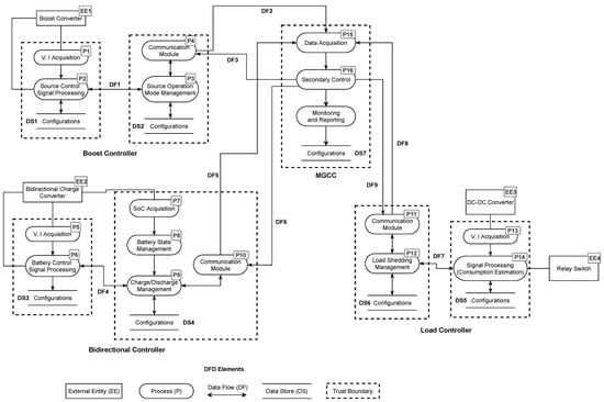 For the threat model, we assume an attacker who has physical access to the network and can capture messages and passively collect information; intercept and modify messages; interfere and disrupt the exchange of messages. Figure 5 shows the data flow graph (DFG) of the microgrid communication system. The DFG helps analyse the threats by highlighting all external endpoints, the flow and storage of data, and functional units, i.e., processes that transform the data in the system. The DFG also helps to indicate the trust boundaries and domains that segregate the system into trusted and untrusted components.