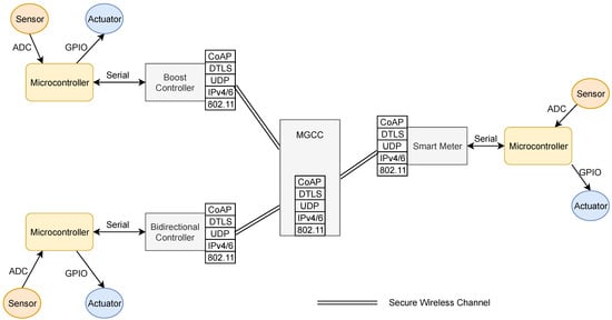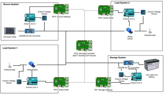 The microgrid central controller (MGCC) connects via WiFi to all other local controllers and smart meters within the communication network. The MGCC uses this network to coordinate the operation of the whole microgrid by sending and receiving control/monitoring signals. In turn, the local controllers and smart meters use these signals to manage their local converters’ operations. In this study, components in the communication network consist of IoT devices such Raspberry Pis, Arduinos, and their sensors.