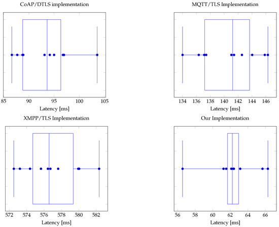 Each component in the communication path contributes a certain amount of delay to the process. As described in Section 5.1, the total communication latency consists of packet processing times at the sender and recipient and the transmission time through the physical medium. For secure communication implementations, operations to establish a secure channel consume a big part of the total communication latency. Previous research has shown that secure implementations of IoT communication protocols have significant latency—mainly due to the extra security handshakes—that is not suitable for power control purposes [13]. Each extra packet exchange during the handshake process increases the connection latency by adding more message round-trip times (RTT).