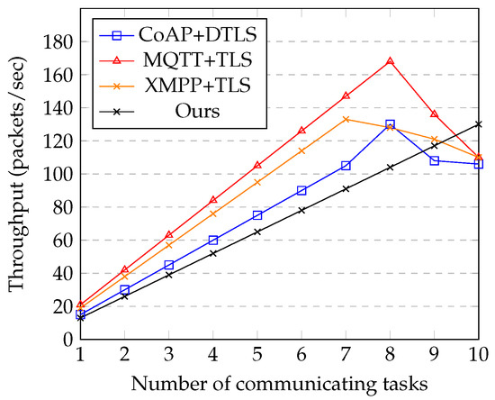 Similarly, we also assessed and scalability of our proposed implementation by measuring the throughput of control messages to see how it is impacted as traffic increased in the communication system. Figure 12 shows how the message throughput at the MGCC for each implementation changes as the number of communicating tasks increase in the system. Results showed that our implementation was able to scale and maintain an increased rate of throughput compared to the other standard implementation. As the number of tasks increased, the total number of control messages going through the MGCC also increased. The MQTT/TLS and XMPP/TLS, being TCP based, had an initial larger number of messages and throughput—21 packets/sec and 19 packets/sec—that steadily increased to a maximum of 168 packets/sec and 133 packets/sec respectively. However, both implementations failed to scale after eight tasks with their throughput performance decreasing.