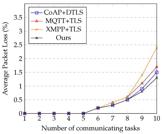 As expected, the average packet loss experienced by each implementation gradually increased as traffic increased in the communication system. As the number of nodes exceeded five, controllers in each implementation started to experience packet drops due to the traffic congestion within the network. Each implementation experienced a similar level of percentage packet loss with the maximum—XMPP/TLS reaching 2.4% packet loss at 10 tasks. The TCP-based implementations—MQTT/TLS and XMPP/TLS—experienced more loss due to the higher number of packets involved in the communication. This increased loss caused packet re-transmissions in the case of MQTT/TLS and XMPP/TLS which found them to be the least scalable. On the other hand, using the optimised handshake and priority-based scheduling, our implementation is still able to scale and maintain consistent latency for the critical control commands. It outperforms the standard CoAP/DTLS implementation which lacks these features.