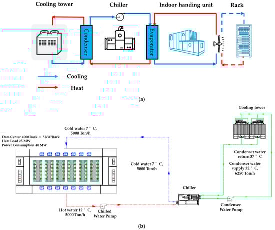 Schematic configurations of conventional cooling systems in data centres: (a) Typical refrigeration system in data centres, (b) Schematic configurations of conventional cooling systems.