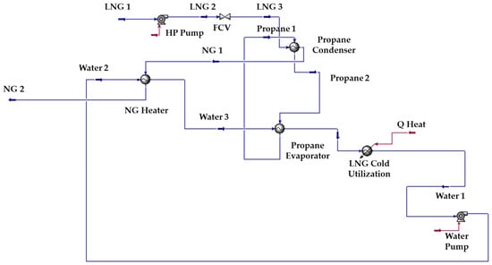 This study uses HYSYS V11.0 (AspenTech, Bedford, USA) as the primary simulation tool. The basic calculation for the system is summarised in Table 1. The water outlet from the vaporiser is kept at 5 °C to meet the data centre requirements. Isentropic efficiencies in all pumps and turbines are set at 75%. The LNG, working fluid and cooling water are pure propane and pure water, respectively. The process flow diagram of an IFV is presented in Figure 5.