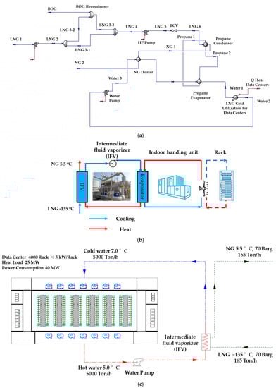 Process flow diagram of LNG receiving terminal combined with a data centre using an IFV: (a) The simulation of data centre using an IFV, (b) Improved refrigeration system with LNG cold energy utilisation, (c) Schematic configurations of data centre using an IFV.