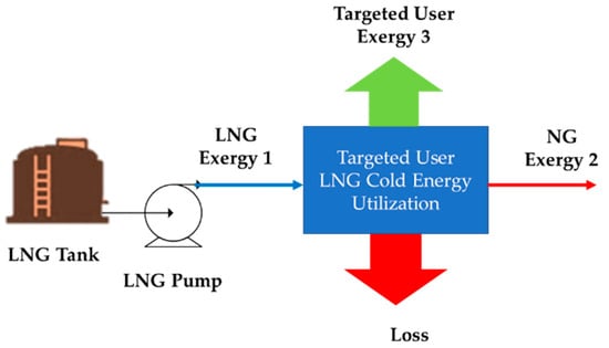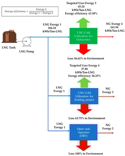 where is the exergy input of Targeted User i (%), is the amount of Exergy obtained by the Targeted User at the facility i (kWh/LNG-Ton), is the amount of Exergy of LNG cold energy consumed at the facility i (kWh/LNG-Ton), as presented in Figure 7.