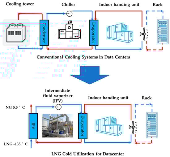 Comparison between conventional cooling systems in data centres and LNG cold utilisation for data centre.