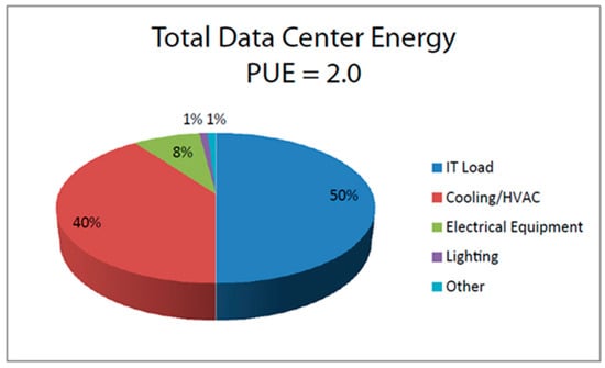IT devices cause huge heat release by transforming electrical energy into thermal energy. It is necessary that the temperature and humidity are controlled in data centres by using a cooling and air conditioning system to remove excess heat and to avoid damage to electrical components [5]. Refrigeration and air conditioning account for ~50% of the total electric usage of a data centre [6,7,8]. The energy consumption of air conditioning has a significant impact on the average power usage effectiveness (PUE) of global data centres. This index is normally ~2.00 [9]. Companies, including Amazon, Microsoft, Google and Facebook, have established data centres in geographic locations that can provide free air cooling in order to reduce energy consumption [10,11]. The average PUE of data centres in Ireland, for example, is ~1.15–1.40. The current status of free and applicable cooling technologies consists of airside free cooling, waterside free cooling [5] and heat pipe technology. Both airside free cooling and waterside free cooling can be integrated with other systems (e.g., absorption, solar systems, adsorption, evaporative cooling and geothermal for increased system performance [12]).