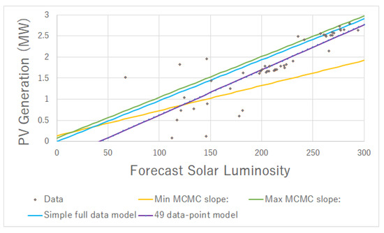 Depending on whether we expect to exceed the 6 MWh full capacity of the battery, either the minimum or maximum slope estimated value for each half hour was chosen to provide the MCMC estimates of the PV generation. For the forecast week in Task 4 in the UK summer solar energy is plentiful and therefore the minimum values were chosen. For Task 3 in the UK winter there is never sufficient solar energy to fully charge the battery in a day and the maximal possible estimate from the solar forecast fit was used. The secondary solar generation model took, for each half hour of the day, a simple mean of the 49 data points to provide a 49-point average energy output and a 49-point average (reanalysed forecasted) solar luminosity. The two models were combined by taking the 49-point average energy output result and then applying an adjustment based on the difference between the forecast solar luminosity and the average solar luminosity (from the 49 data points). If we expected to have plentiful solar over the day (e.g., Task 4) then the adjustment could only be downwards. Where there was expected to be insufficient solar (e.g., Task 3), the adjustment could only be upwards. The adjustment made is to multiple the MCMC slope (either minimum or maximum) by the difference in forecasted solar luminosity and the 49-point average solar luminosity. The forecast energy outputs over the charging period were then normalised to sum to 12 MW.
