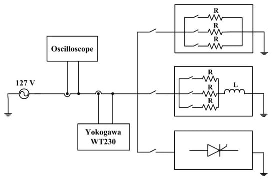 With the aim of ascertaining the sampling rate effects, an experimental set consisting of linear and non-linear loads was constructed to verify the results in different scenarios. Thus, the system currents could be acquired at different sampling rates to perform power calculations based on CPT. Figure 1 represents the arrangement for data acquisition. The system effective supply voltage is 127 V, i.e., standard voltage at Brazil for single-phase loads. In the first scenario, only resistive loads are used in which the approximate value of each resistance is 138 Ω. The second scenario consists of an inductance with an approximate value of 20 mH which is series-connected with an array of resistive loads equivalent to those previously described. It is important to note that these values may vary mainly because of temperature variations and, thus, the importance of acquiring the loads’ data to perform the analysis. A non-linear load is applied in the last scenario, where a semi-controlled rectifier is used.