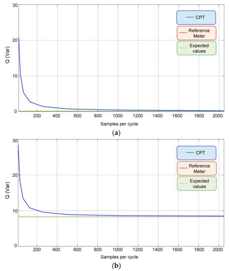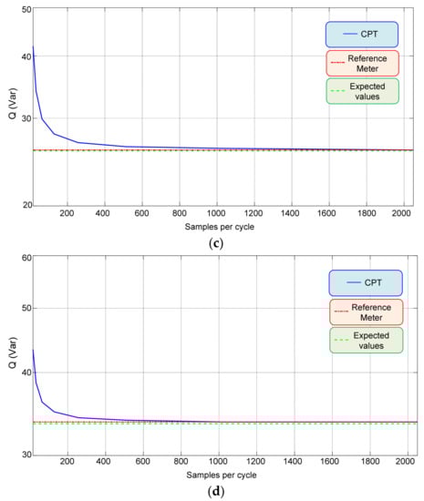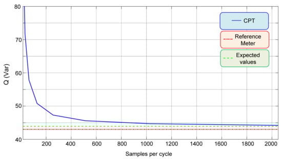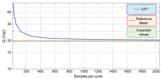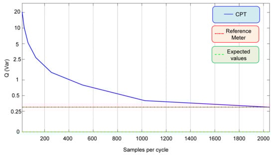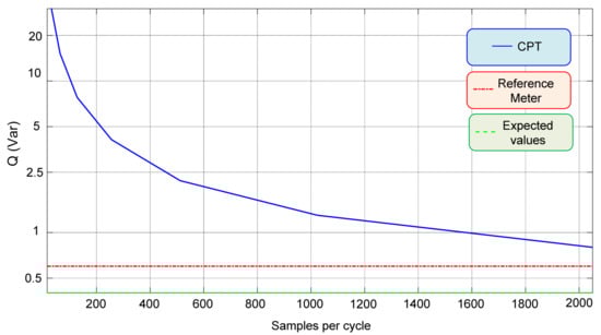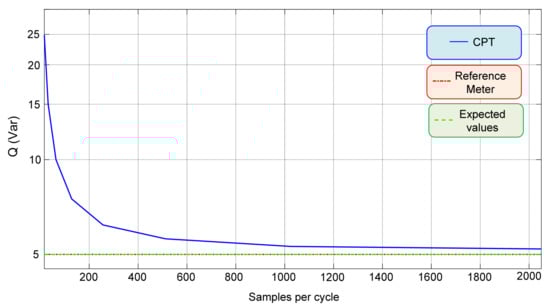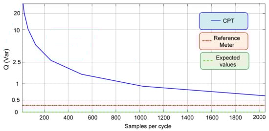 The reactive power values approximate the measured and the expected references when the sampling rate is increased. The sampling rate significantly interferes with the calculation of Q due to the impartial integral. On the other hand, it appears that the values of active power are not influenced by the sampling rate. The convergence of reactive power can be visualized employing Figure 2, Figure 3 and Figure 4, where the graphs of the values calculated by the CPT and the measured and expected references are presented.