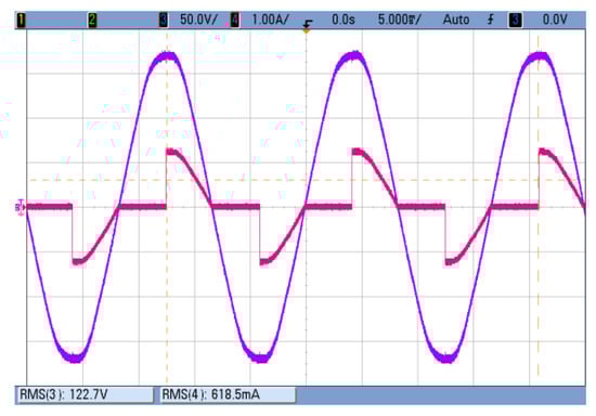 For this scenario, the test was performed using a semi-controlled rectifier as a load supplying a resistive load at the output. The experiment was carried out by varying the firing angle and monitoring the active and reactive powers. To demonstrate the waveforms that feed the rectifier, Figure 8 depicts the voltage and current for a 90° firing angle.