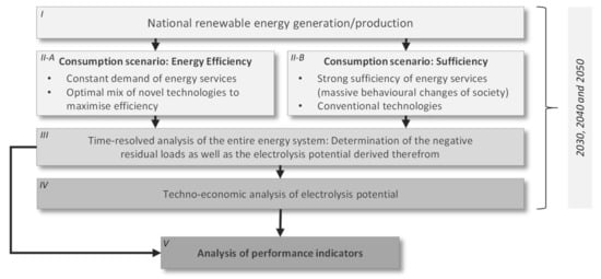 However, an integrated consideration of the entire energy system (all sectors, all energy carriers, from resource to energy service) is important to obtain meaningful results. Such a holistic consideration is necessary for the calculation of the actual residual loads. The residual load is the not controllable electricity demand minus the not controllable electricity generation. Not controllable generations are fluctuating generations such as photovoltaics as well as heat-driven CHPs. If the not controllable electricity generation is higher or lower than the not controllable electricity demand, it is known as negative or positive residual load, respectively. The positive residual load must be compensated by controllable electricity generation (e.g., gas-fired power plants) or discharging of electricity storages. The negative residual load can be handled by renewable generation reduction or can be used for different applications, such as the production of hydrogen. To maximise the overall efficiency of the energy system, mainly negative residual load should be used for hydrogen production. For example, this approach was used to analyse the annual hydrogen production in Italy [28]. Otherwise, avoidable conversion losses will occur (production of hydrogen and controllable electricity generation at the same time).