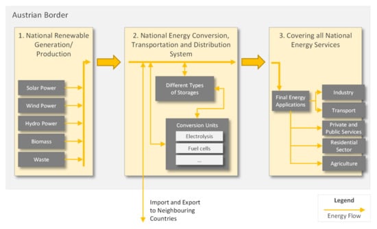 In this model (Figure 2), the renewable generation/production and the required energy services are defined by boundaries conditions. Thus, the renewable generation/production can never exceed the predefined amounts and temporal behaviour, and all predefined energy services must always be covered. The national energy conversion, transportation and distribution system must compensate all temporal differences between renewable generation/production and final energy applications. Furthermore, the required type (e.g., electricity, heat or fuel) of final energy has to be provided. To achieve this, different controllable conversion units, storages as well as import/export to neighbouring countries can be used.