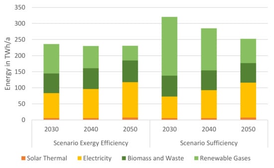 Comparison of the primary energy consumption: The primary energy consumption of the two scenarios for all years is shown in Figure 3. The comparison shows that the scenario Energy Efficiency has a lower consumption than the other scenario for each considered year. The difference is mainly caused by the utilisation of renewable gases. Both scenarios have a decreasing renewable gas consumption over the years, but scenario Sufficiency starts at a significantly higher level. The utilisation of electricity, solar thermal energy as well as biomass and waste are comparable for both scenarios. The electricity consumption increases over the years in both scenarios.