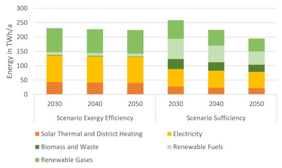 The scenario Sufficiency is based on renewable generation/production according to Table 1 as well as on the work of the Environment Agency Austria (EAA). The EAA published different possible future development energy scenarios for the Austrian energy system until 2050 [49] to satisfy the report requirements according to EU regulation No. 525/2013 [50]. All these EAA scenarios consider the entire energy system, from resource to energy service for all subordinated economic sectors (e.g., industry, residential sector, transport) and energy carriers. Furthermore, import and export are included. The EAA scenarios differ mainly in their assumptions regarding the implementation of energy efficiency and novel technologies as well as behavioural changes of society. Overall, the EAA scenarios cover a wide range from business as usual to very radical changes. The scenario Sufficiency in this work is based on the EAA scenario WAMplus (With Additional Measures Plus), which is the most ambitious scenario and strongly relies on sufficiency measures.