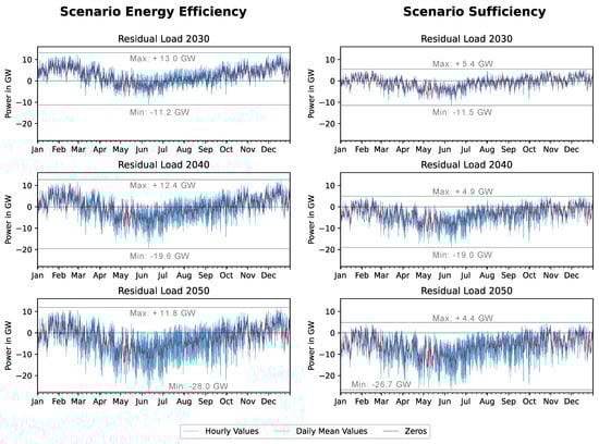 The residual loads of the scenario Energy Efficiency show more positive values in both winter and summer than the scenario Sufficiency (Figure 5). This is also indicated by the maximum annual positive residual load (2030: 13.0 compared to 5.4 GWel; 2040: 12.4 compared to 4.9 GWel, 2050: 11.8 compared to 4.4 GWel). In total, positive residual loads for the scenario Energy Efficiency sum up to 27, 17 and 11 TWhel/a for the considered years 2030, 2040 and 2050, respectively. In contrast, in the scenario Sufficiency, the accumulated positive residual load is much lower (2030: 6 TWhel/a, 2040: 3 TWhel/a, 2050: 1 TWhel/a). Positive residual loads must always be compensated by controllable plants. When analysing negative residual loads, both scenarios show comparable maximum negative values for each year. However, scenario Energy Efficiency has significantly negative residual loads for each considered year (2030: −6 compared to −13 TWhel/a; 2040: −18 compared to −33 TWhel/a, 2050: −35 compared to −54 TWhel/a).