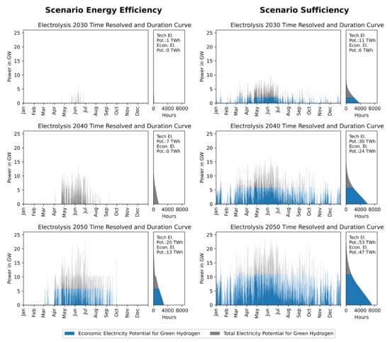 In the next step, the maximum number of economic full-load hours are analysed in combination with the negative residual loads available for green hydrogen production. For each considered year, the number of full-load hours is determined for each possible power of the residual load (between 0 and its maximum power in 0.01 MWel steps). If the number of full-load hours of a certain power is equal to the economic full-load hours determined in the first step, the maximum economic power limit is found. This power limit represents the maximum economic electrolysis power (in GWel). This analysis is performed for both scenarios and all the considered years. The maximum electrolysis power determined in this way ensure that the previously defined maximal LCOH2 economic limit for hydrogen is not exceeded.