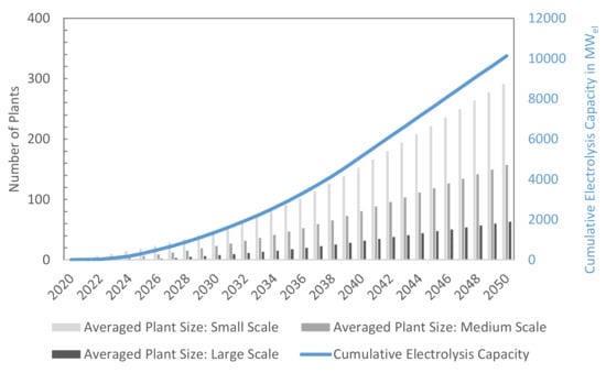 For taking into account economies of scale, we use a mix of representative reference plant scalings. The scalings correspond to the economic data reference on component cost structures and corresponding scale factors [54] resulting in large scale industrial facilities. The reference plants are differentiated into small plants with a power range between 1 and 10 MWel, medium plants between 10 and 50 MWel and large plants between 50 and 100 MWel. Cost transformations through innovation (efficiency, durability, design), plant size (targeting up to 100 MWel), component assembly lines and gigafactories will be needed to reach the anticipated roll-out curve of electrolyser plants, although there are hardly any plants of this size on the market, and there is little operating experience at the moment. For each year, a plant mix based on these reference plants was generated that can optimally process the previously calculated negative residual loads that are available for electrolysis. The ramp-up of the theoretical electrolysis potential is based on a CAGR (Compound Annual Growth Rate) of 25% [59] in the years 2020–2050 for all reference plants in line with corresponding press releases in this area, whereby the required ramp-up is massive and the forecast horizon is clearly a very long one and therefore highly uncertain.