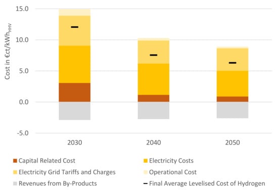 In Table 2, all input parameters including the cost structures for the electrolysis reference plants for the techno-economic assessment are listed. For the economic evaluation, the electricity procurement costs for the electrolysis operation are derived from a mix of wind and PV generation costs and electricity grid tariffs/charges, based on optimal conditions and cross-checked with other prognoses on electricity prices [56]. In the medium and long term, decreasing electricity production costs from renewables is to be expected (Table 2) [54,57].