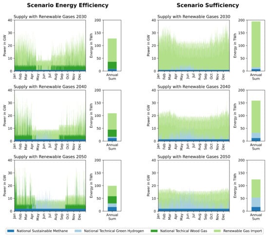 Fossil fuels (e.g., coal, fuel oil, natural gas) for space and process heating as well as stationary engines in the residential, public and private services sectors as well as agriculture are fully replaced by renewable gases. Furthermore, also in the district heating supply, renewable gases replace natural gas entirely.