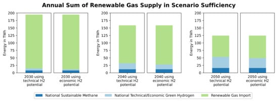 Answering the research questions using the mentioned approach provides a valuable contribution to scientific knowledge. The contribution consists of two aspects: methodology and results. In this work, entire national energy system models (including all sectors and all energy carriers) are used. Entire national energy system models such as EnergyPLAN [30] are common in the scientific literature and include both technical and economic aspects. The analysis of such models is often used for feasibility studies of national decarbonisation strategies (e.g., [31,32,33,34]). Furthermore, different pathways can be compared to determine the minimum cost of decarbonisation. These studies do include hydrogen, but it is not the focus of the research questions. In addition to this, there are also studies that investigate hydrogen and its production in detail but do not take all sectors into account (e.g., [28,35]). Thereby, negative residual loads are used to determine the hydrogen production. Since not all sectors are considered, the residual load does not include the electrification of the other sectors that may be necessary to enable complete decarbonisation (e.g., heat pumps or battery electric vehicles). Furthermore, no statements can be made about the total gas demand in the future system. This work combines both types of studies: The focus is on hydrogen potential and costs, but in the background the complete energy system and the complete decarbonisation strategy is considered. Such a combination has not been seen before and represents a further development and improvement of existing approaches.
